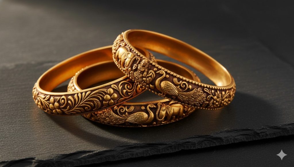 - Avoid Polishing: Never give your antique bangles to a local jeweler for “cleaning” unless you specify “Do Not Polish.” If they put it on a buffing machine, they will scrub off the black antique finish, and your expensive temple bangle will look like generic shiny gold.