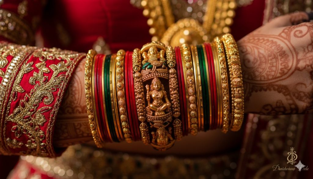 - Middle: Fill the space with 6-8 plain gold bangles or colored glass bangles (matching your saree).