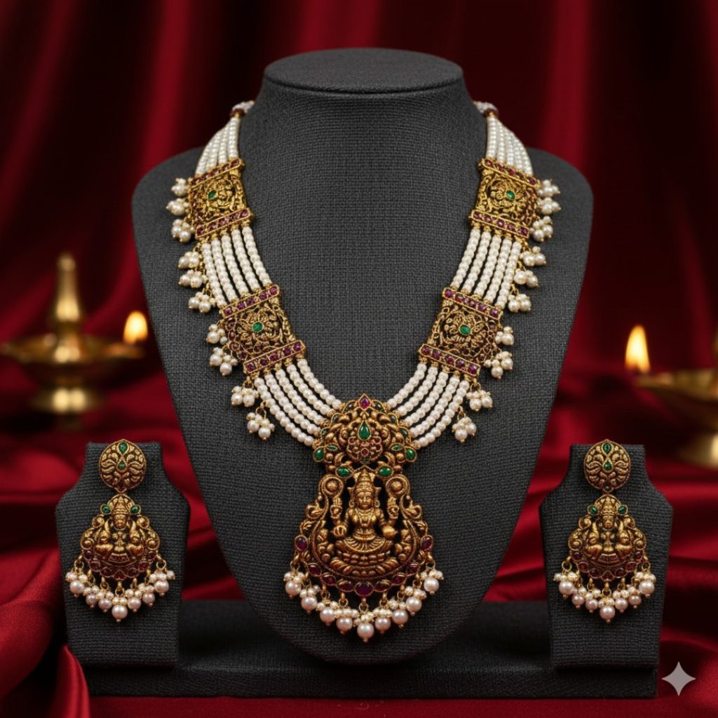 - The Concept: “Nakshi” refers to the art of carving gold into 3D figures. These Haars don’t just have floral patterns; they tell a story.
