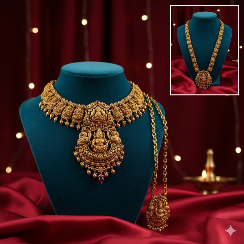 - Why it works: It adds a divine, spiritual element to your wedding. The finish is usually “Antique Matte” (reddish-yellow), which looks stunning against Kanjeevaram silks.