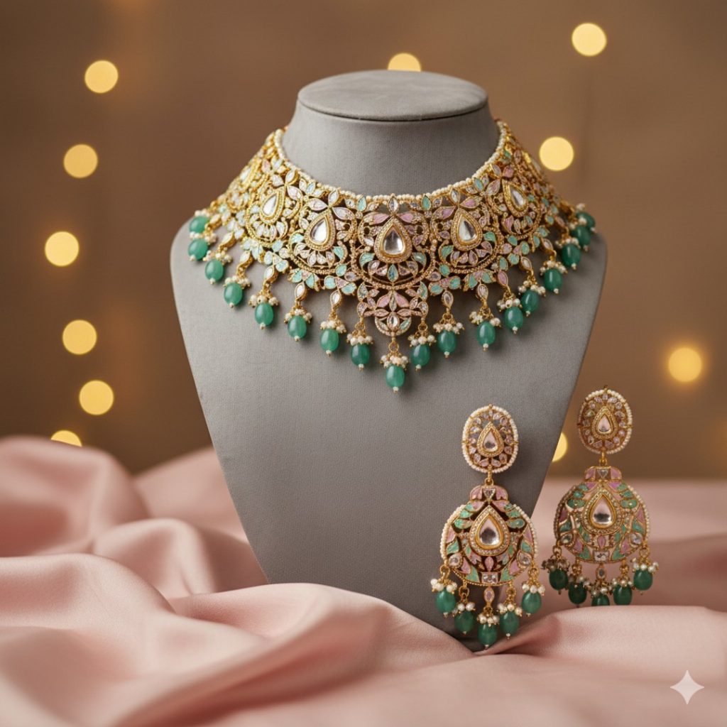 Not necessarily! In 2025, “Mix and Match” is trending. You can pair a Polki Choker (uncut diamonds) with a Gold Rani Haar. The key is to keep the tone of gold similar (e.g., don’t mix bright yellow gold with antique reddish gold). The contrast in texture actually adds depth to your look.