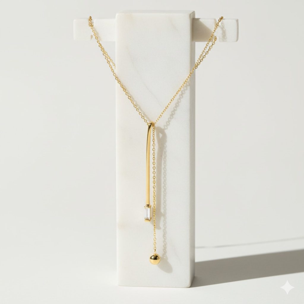- The Design: A delicate chain that sits around the neck and drops a long, single strand down the center of the chest (forming a “Y” shape).