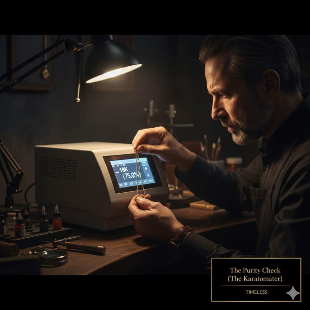 • Non-Hallmarked Gold: If your gold is old and unstamped, the jeweler will put it in a Karatometer (XRF machine). It scans the surface to tell the purity (e.g., 18k, 20k, or 22k).