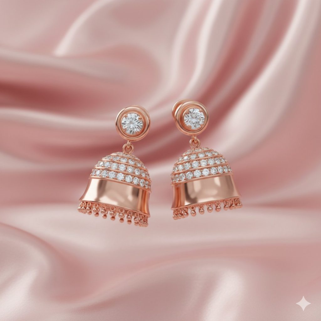 The pinkish hue of the gold makes the jhumka look less “traditional” and more “chic.” It is perfect for women who don’t usually wear gold but want something for a family function.