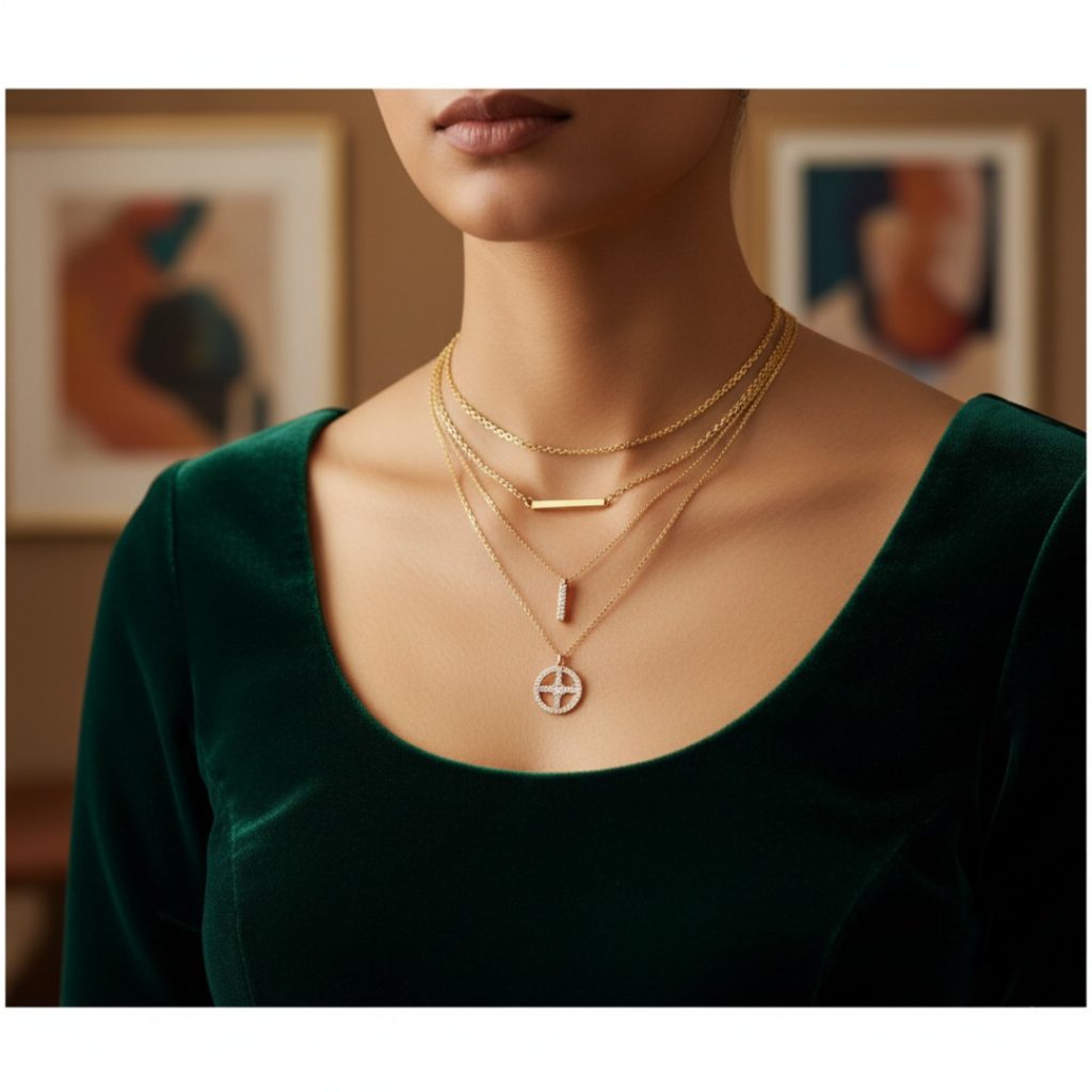 You might have a small heart on the shortest chain, a coin pendant on the medium chain, and a longer vertical bar on the last chain. Many jewelers are now selling “Pre-Layered” sets where the three chains are attached to a single clasp to prevent tangling.