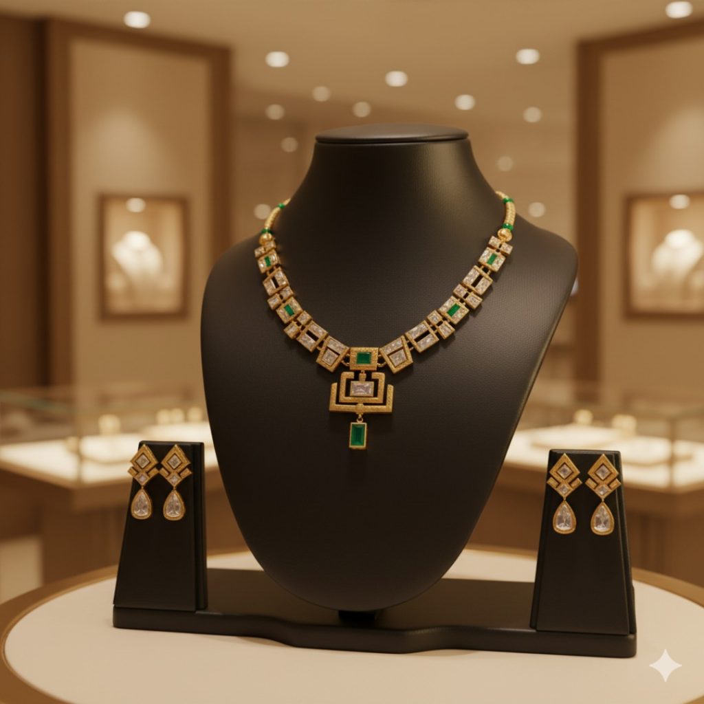 The “Emerald Fusion” Celebrity-Inspired Gold Pendant Set usually features a 22k gold pendant with a central green synthetic stone or a semi-precious emerald, surrounded by cubic zirconia (CZ) or small diamonds. The contrast of the deep green against the warm yellow gold is absolutely stunning and photographs beautifully.