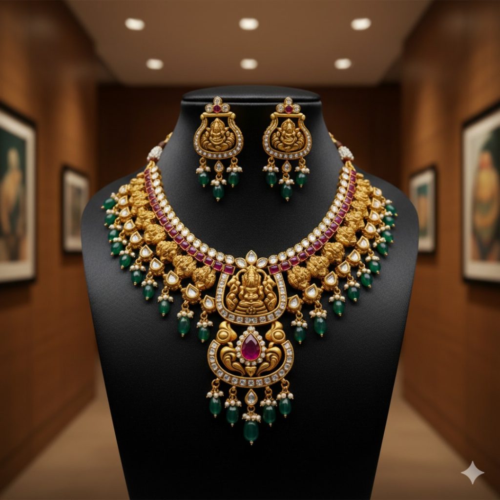 Technical Details: When asking your jeweler for this, specifically ask for “Nakas Work.” This is the technique used to create those 3D embossed gods and goddesses. Also, check if the piece is solid or filled with lac (wax). Traditional Temple jewelry often has a wax filling to prevent denting, but you should only pay for the gold weight, not the wax!