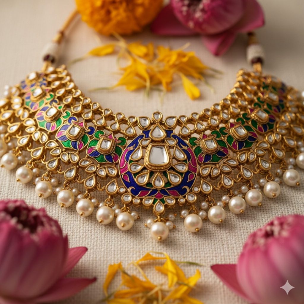 “Yellow” gold is timeless, but current trends favor a slightly antique or matte finish. If your gold is too shiny/yellow, style it with darker clothes (Maroon, Bottle Green, Navy Blue). The dark fabric absorbs some of the glare, making the gold look richer and less “blingy.”
