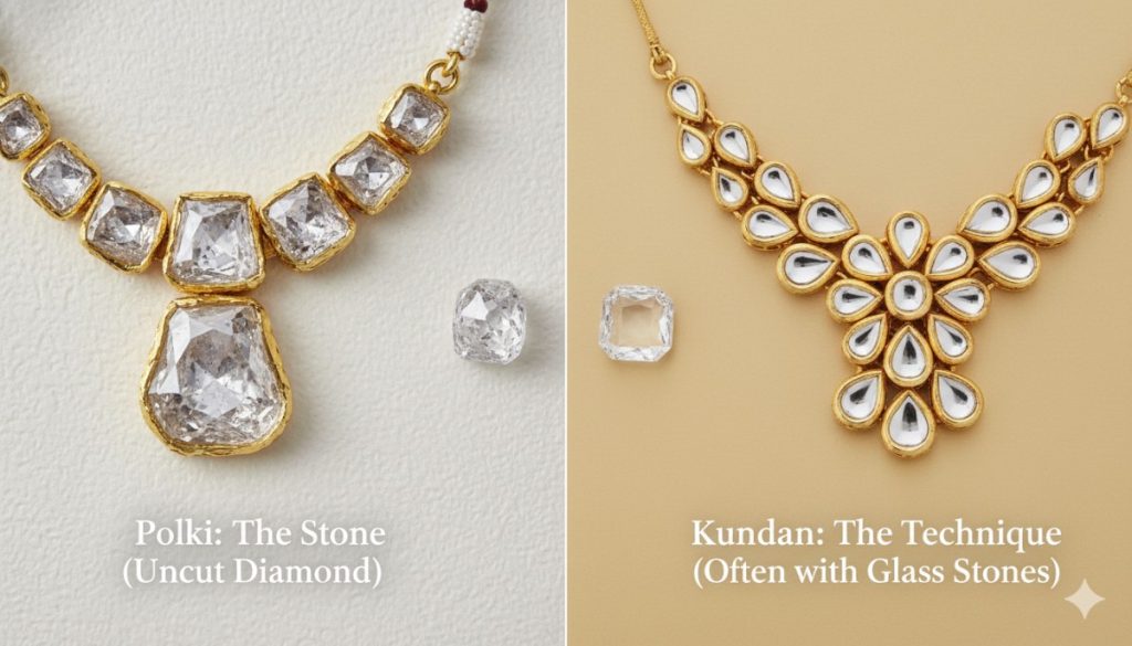 • Kundan: This refers to the Technique. However, in market terms, “Kundan Jewelry” often implies stones that are Glass (not diamonds) set in gold foil.