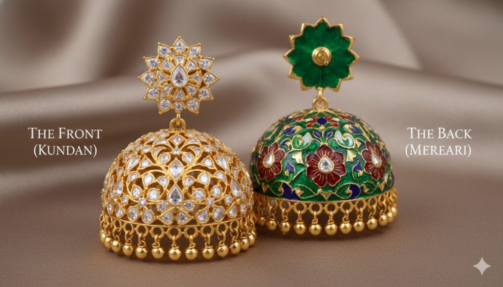 Jaipur Kundan: Often features heavy Meenakari (enamel) work on the reverse side (Red/Green/White).