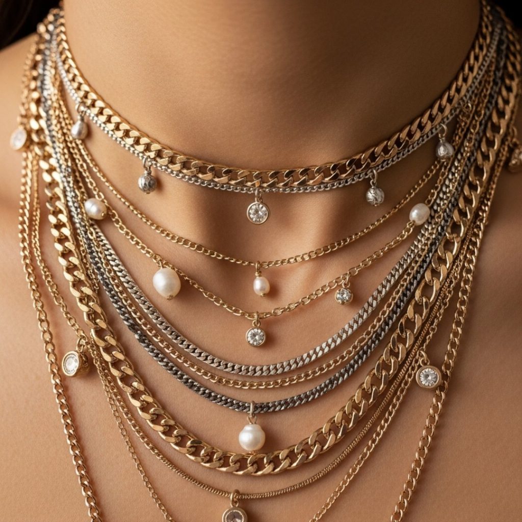 You have probably seen this on every influencer’s feed, and for good reason. The “Second Skin” trend involves wearing 2 or 3 ultra-fine gold chains of different textures—like a Paperclip link, a Herringbone flat chain, and a simple cable chain.