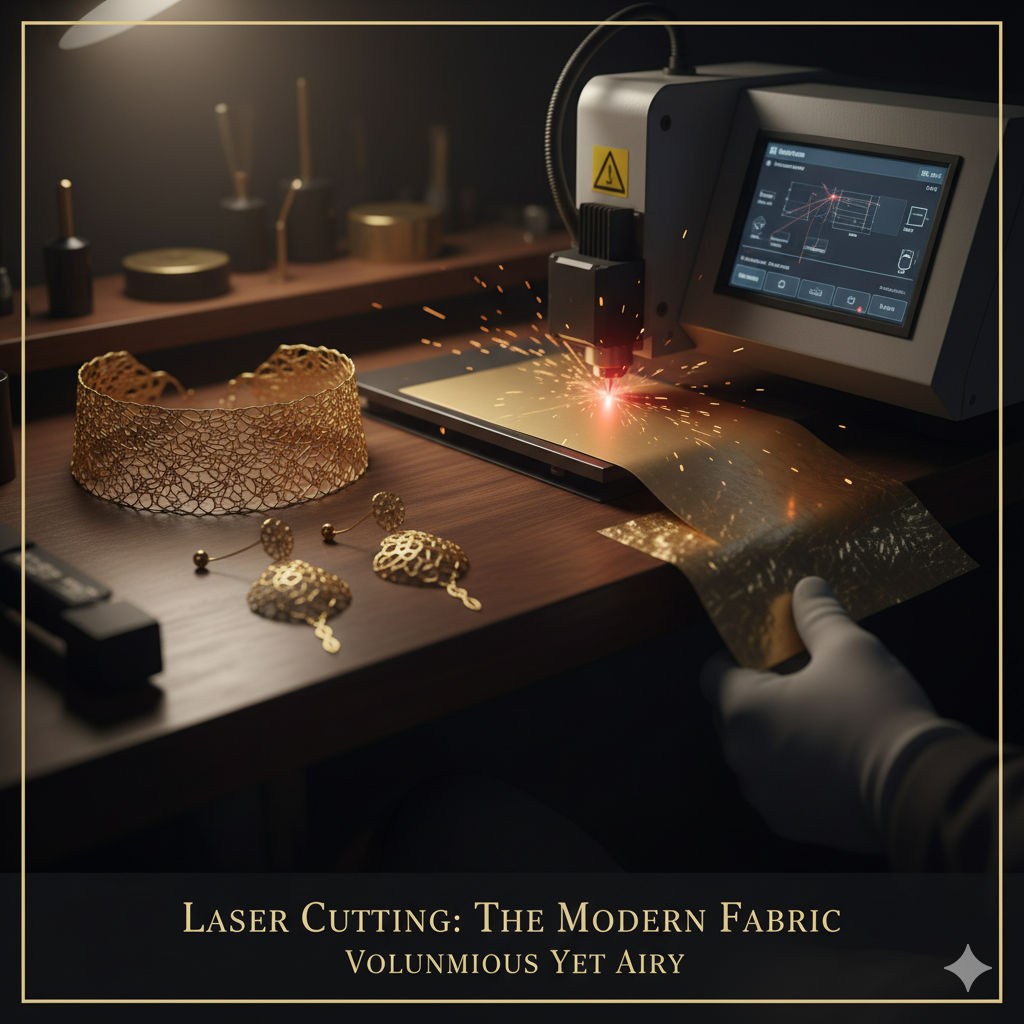 2. Laser Cutting: Instead of hand-beating gold (which requires density), machines laser-cut intricate lattice patterns into thin gold sheets. This creates designs that look like lace—voluminous but airy.