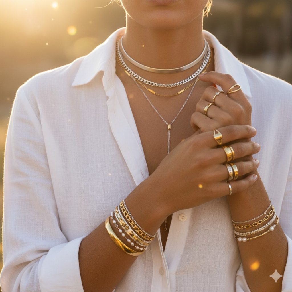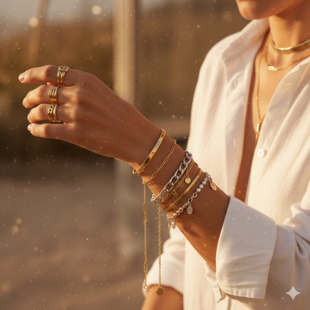 But fashion has evolved. In 2025, we don’t just wear jewelry; we curate it. We are in the era of the #NeckMess and the #WristStack. The goal isn’t to look perfectly matched. The goal is to look interesting. To look like you collected these pieces over years of travel and life experiences.