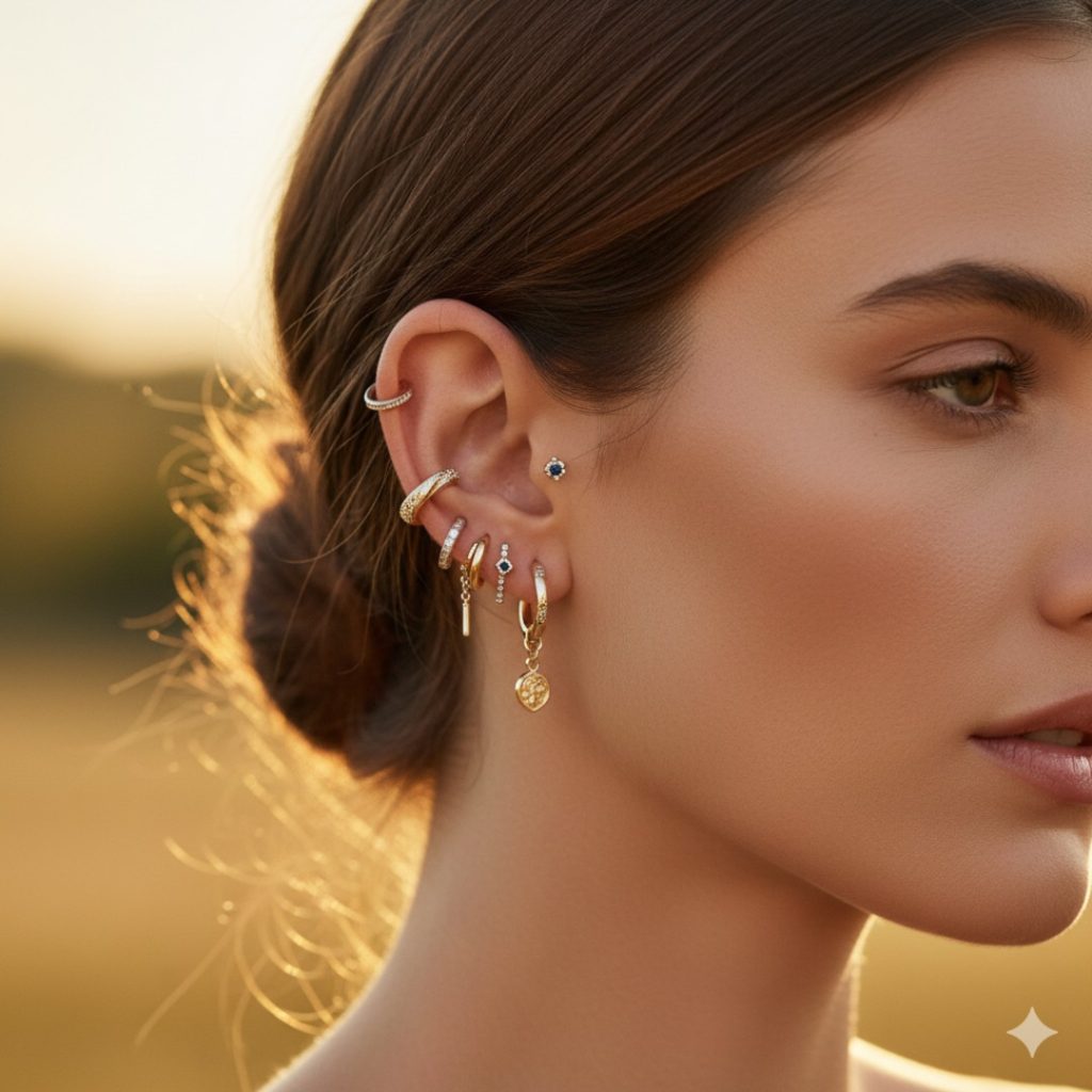 - Lobe 1 (Main Hole): The biggest earring. A Gold Huggie Hoop or a small geometric stud.