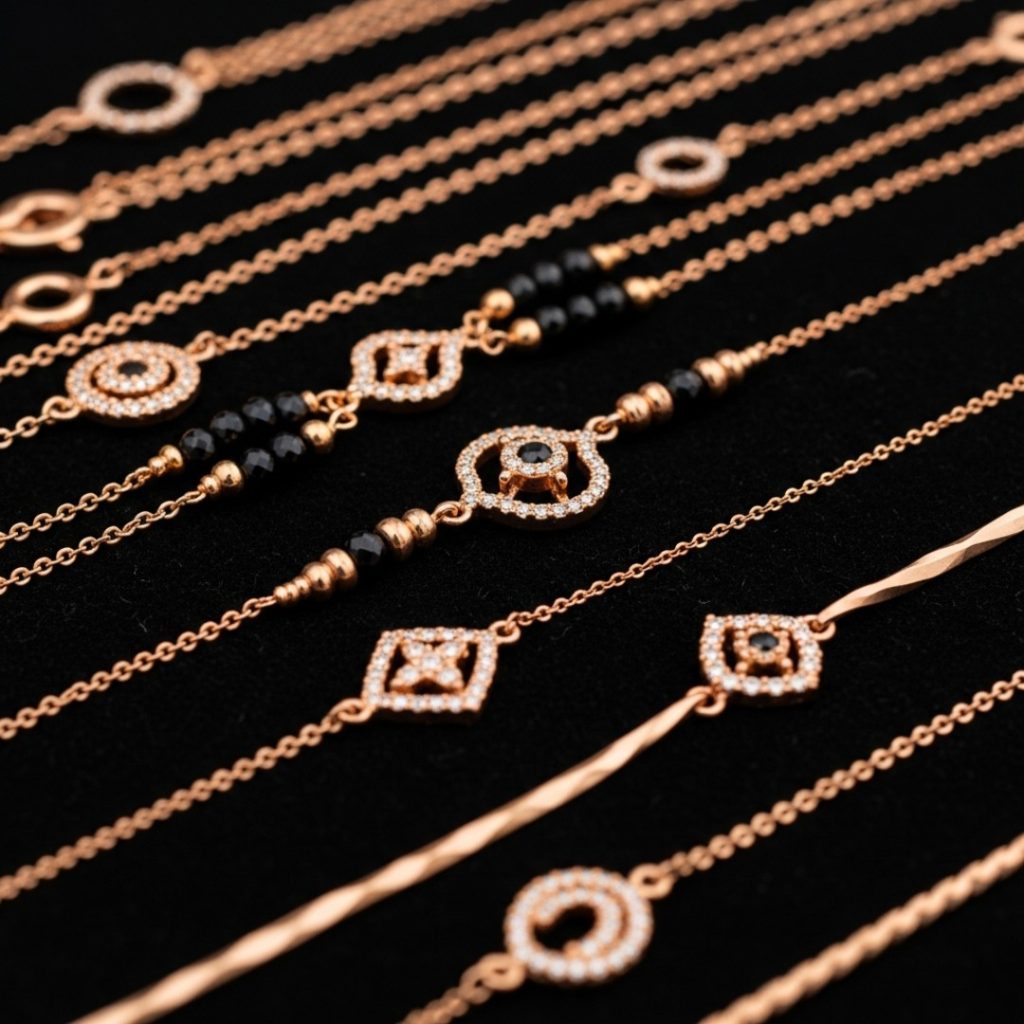 - The Look: A short, sleek chain with just 5-7 black beads (to respect tradition) and a diamond pendant set in 18k Rose Gold.