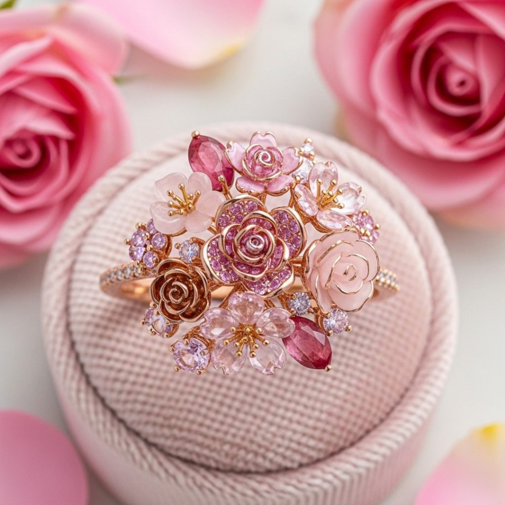 - The Trend: 3D Floral Rings where the petals are made of matte-finish rose gold, and the center is a tiny diamond.